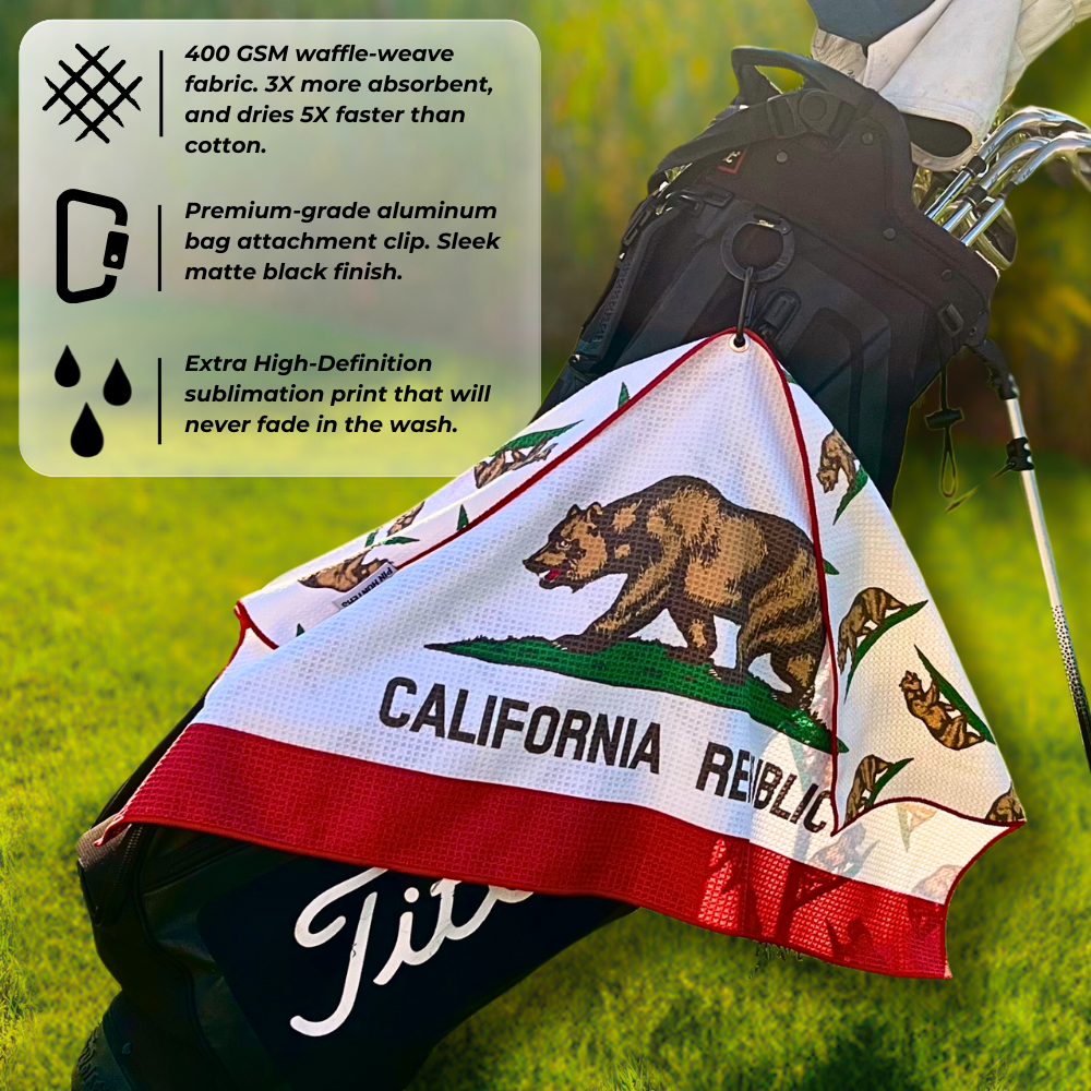 Show your California pride on the green with the Pin Hunters California Flag golf towel! This premium microfiber golf towel features the iconic California Bear Flag design, making it the perfect accessory for any California golfer. Keep your clubs clean and your game strong with this high-quality California golf towel.