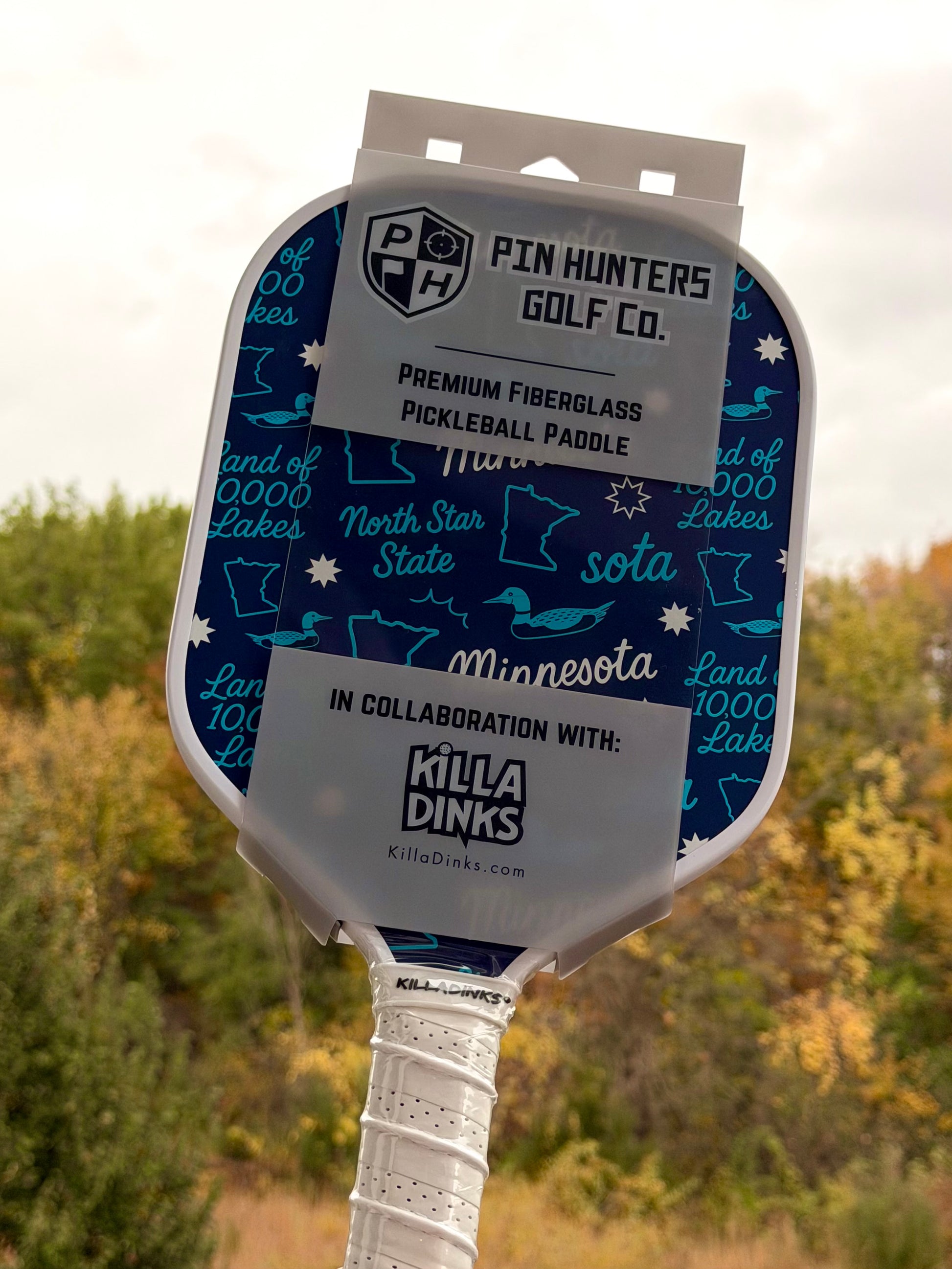 Take your game up a notch with the Pin Hunters x Killa Dinks Pickleball Paddle. Designed for all skill levels, this paddle combines a gritty fiberglass face for added spin with a lightweight honeycomb core for control and power on every shot.