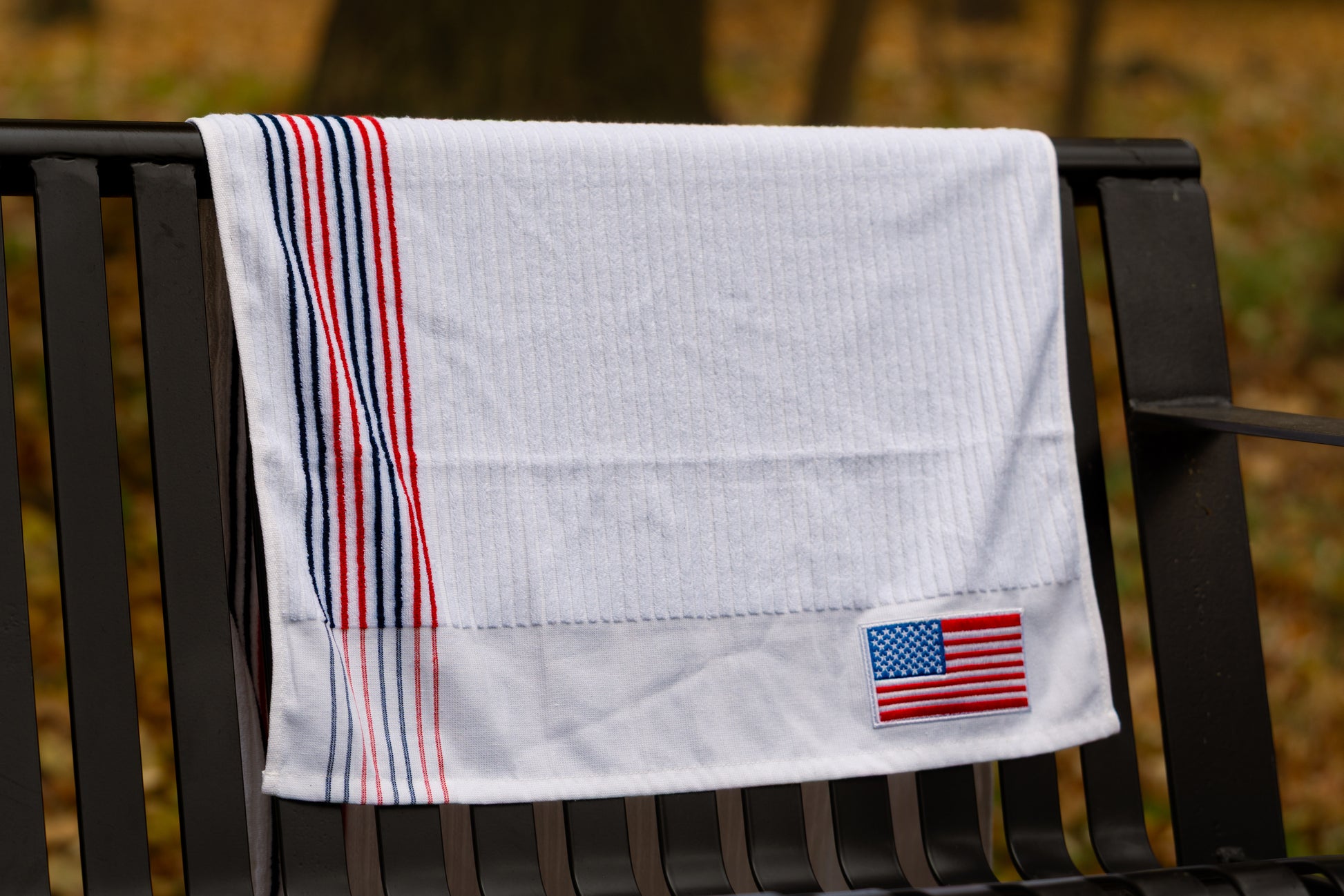 Made for golfers who like a clean look with a patriotic edge. This white tour-style caddie towel features bold blue and red stripes and a sharp USA flag patch for a crisp, all-American finish.